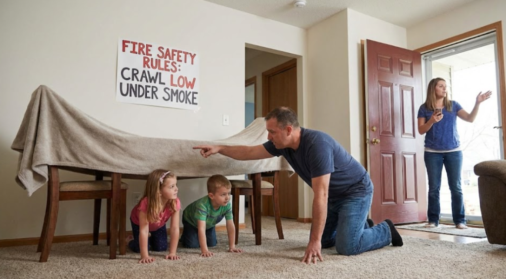 Crawl Low Under Smoke – Smoke rises, so cleaner air is near the floor. Practice crawling to exits.
